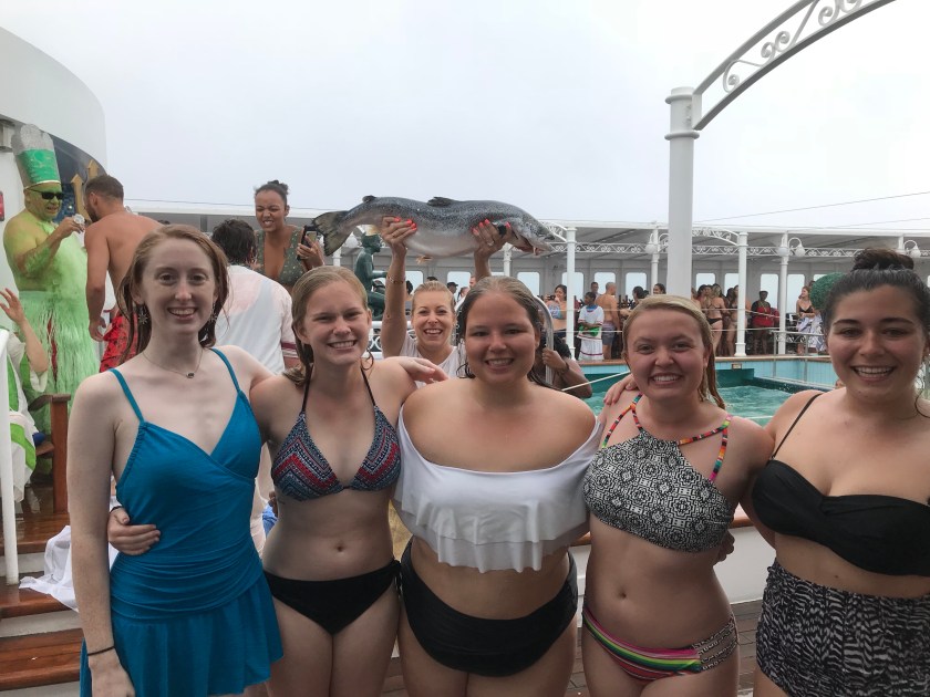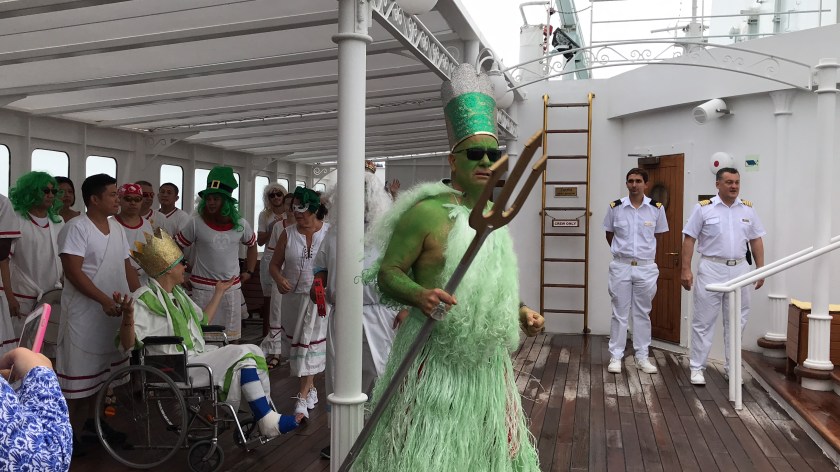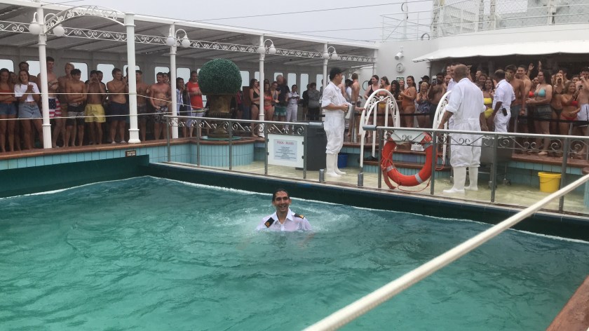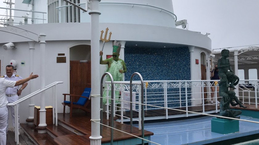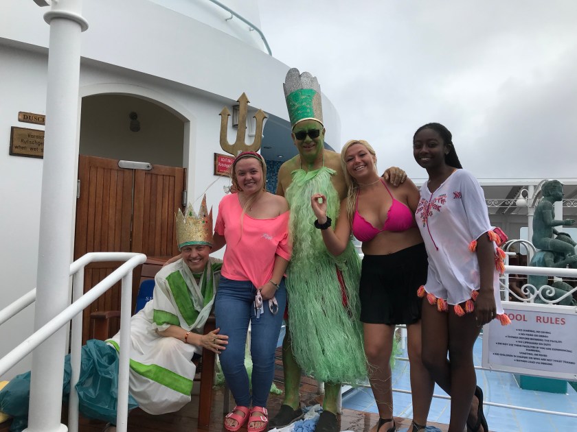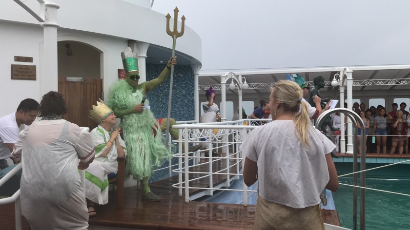 We were startled awake at 7am by the staculty and crew members parading through our cabin hallways dressed in white robes and bright green wigs while banging on pans, blowing horns and shaking tambourines. It was quite the wake-up call! We were then used through the breakfast line on the cafeteria and instructed to get our bathing suits on and head up to the Lido deck and gather around the pool.