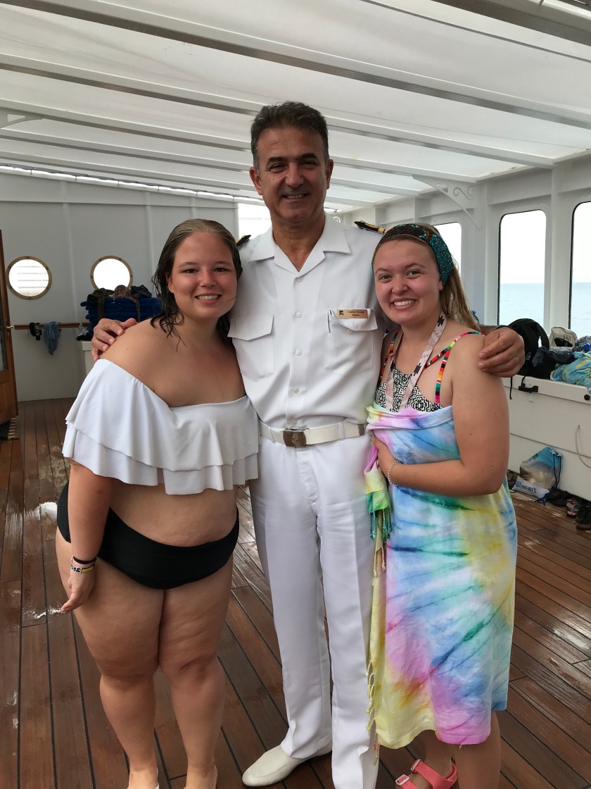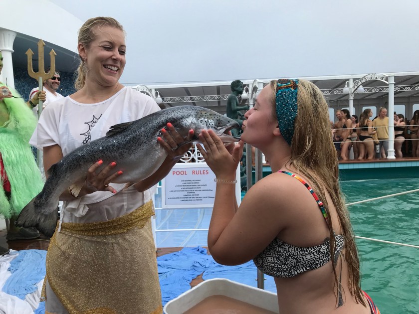 The Neptune Day rituals we all partook in consisted of being dumped on with fish slime and swimming across the pool, which was dyed green to reach King Neptune and his mighty fish. After climbing out of the pool, we then were face-to-face with a fish awaiting a smooch. After kissing the fish, we kissed King Neptune’s ring and paid our respects and love to his beautiful Queen then made our way across the bridge to be knighted and granted the title of Emerald Shellbacks.