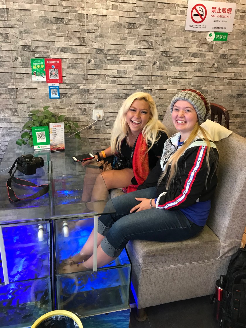 Upon flying back to Shanghai, my roommate Jessie and I wandered around the city looking for a shuttle bus to Zhujiajiao, a water village on the outskirts of Shanghai. We took a row-boat ride through the village and wandered in and out of the various trinket shops and markets. We also stumbled upon a shop that offered fish pedicures and we couldn’t pass up the opportunity to try it out! It was such a peculiar feeling, it tickled so much at first but quickly became relaxing. We spent nearly 30 minutes with our feet in the fish tanks! We also bought a few natural pearl bracelets from a man in the village and some really neat yarn-woven art pieces of the Great Wall from his neighbor. It was great to spend the day in a serene, slow-paced moment, contrary to our semester as a whole.