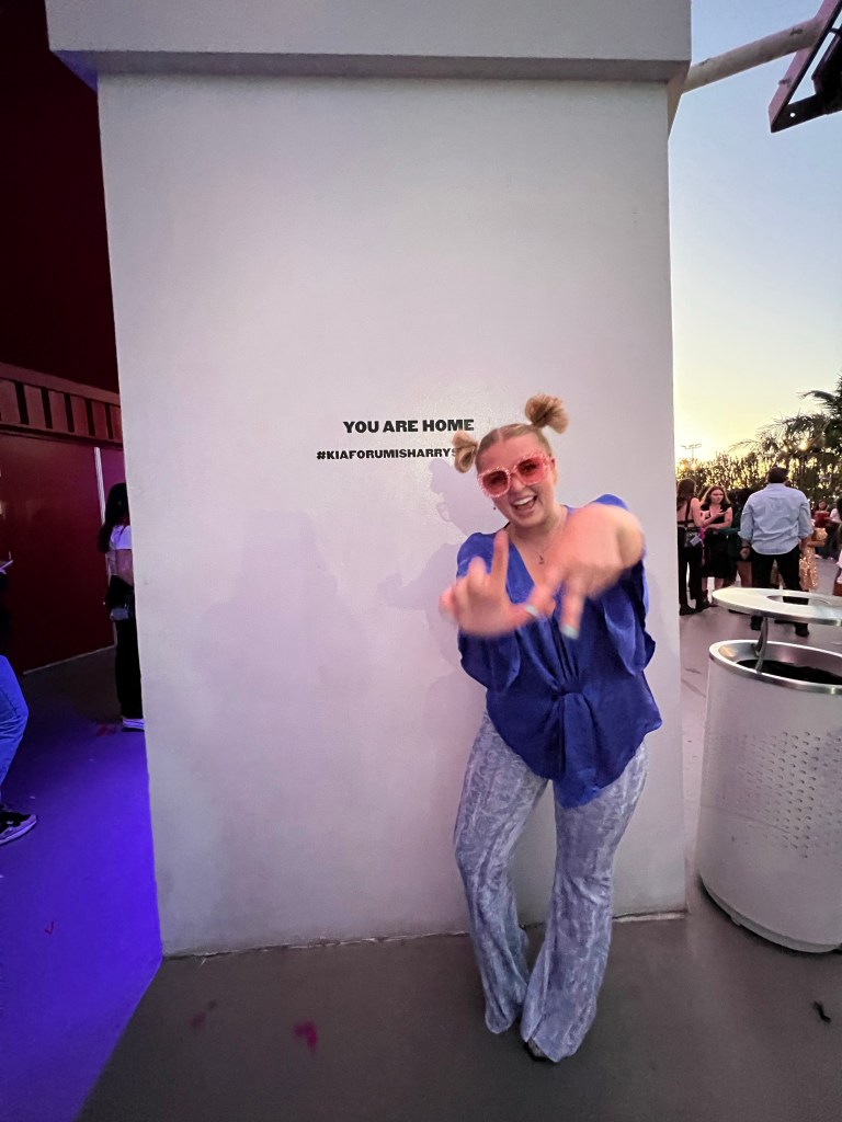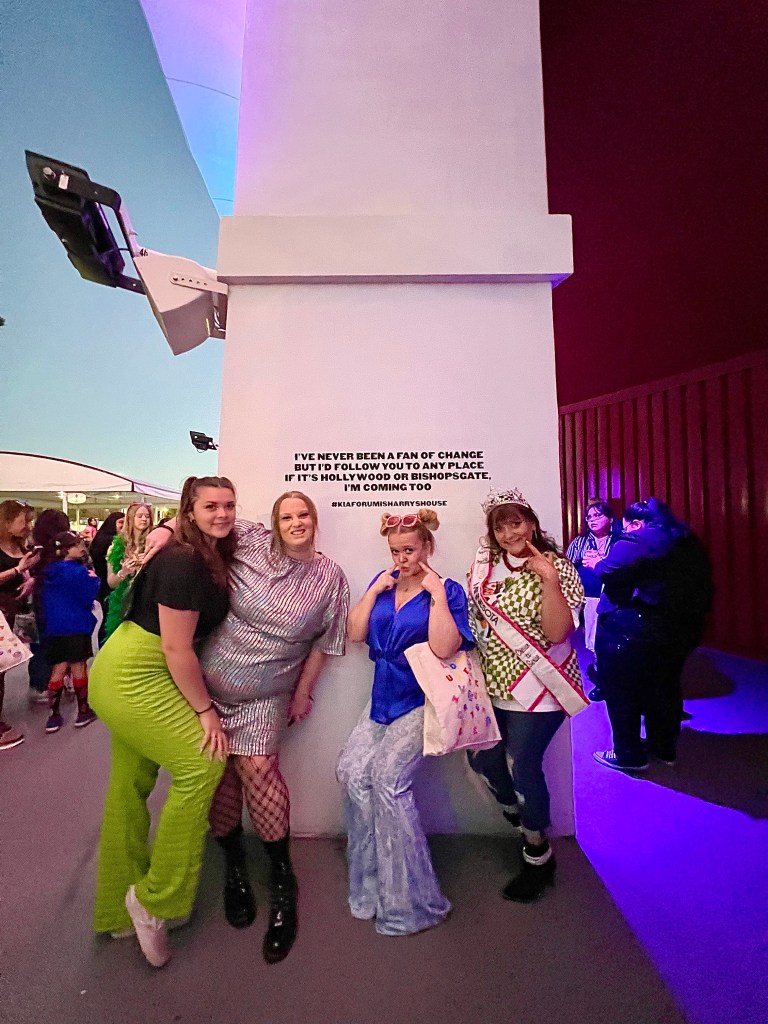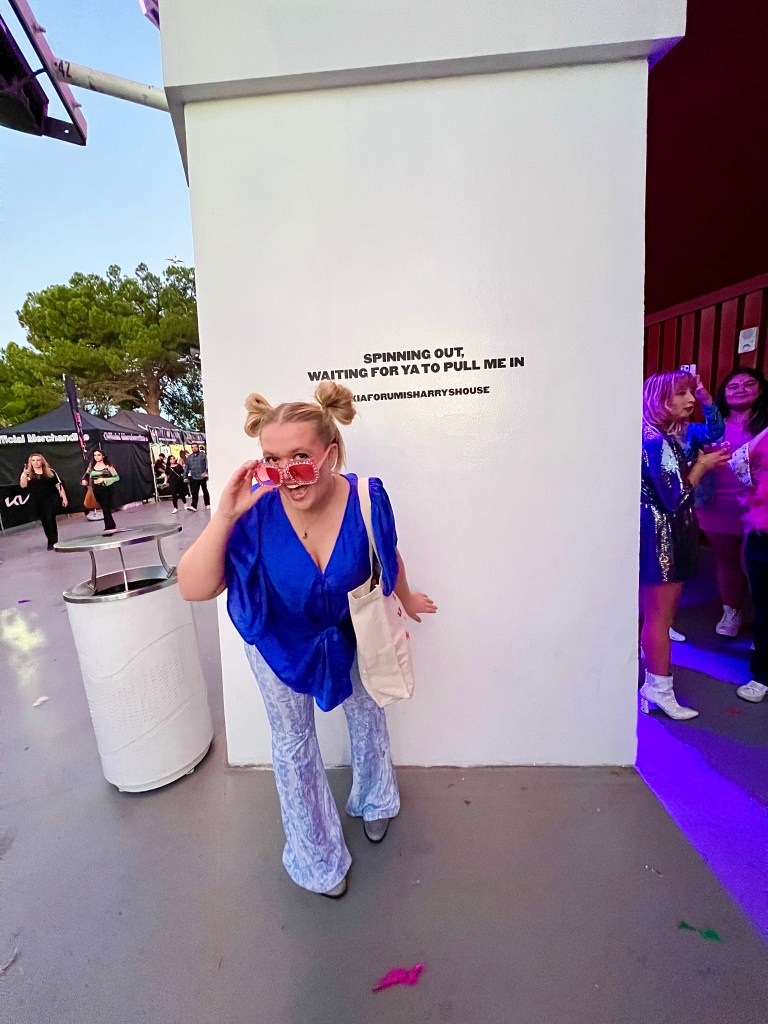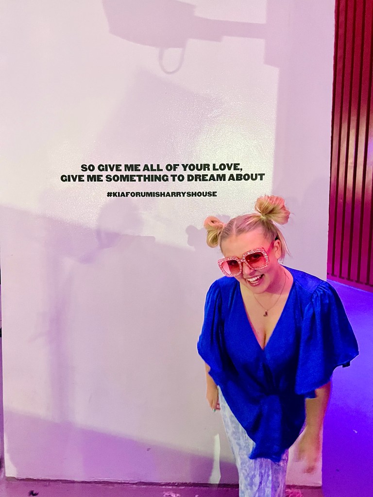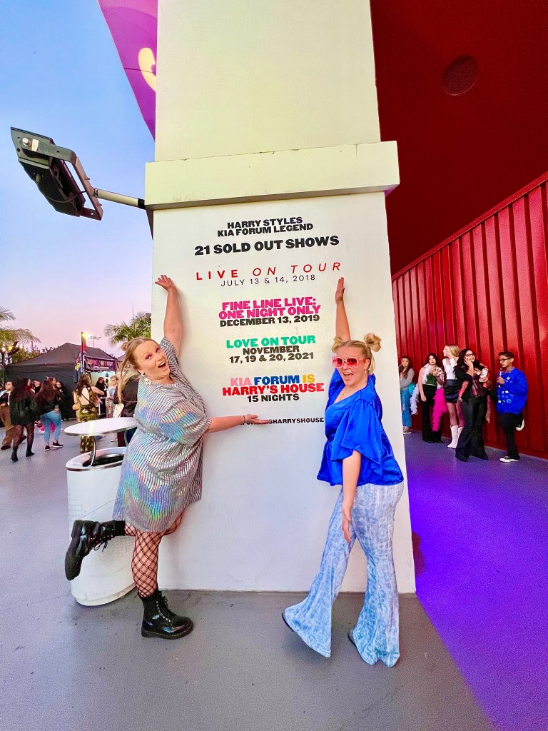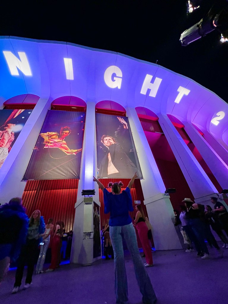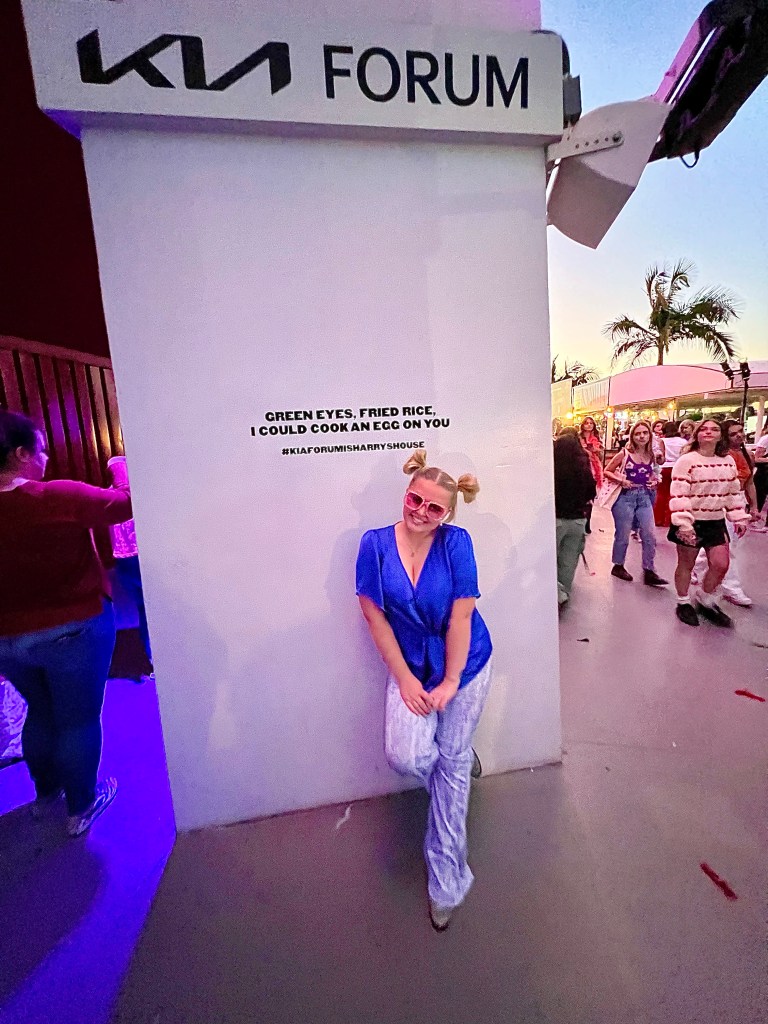 The venue itself was absolutely stunning, as expected! We arrived right during golden hour and the sunshine hitting the Forum made for a glowy backdrop. It felt so warm and like I was coming home after a long trip away. Very fitting for Harry’s House theme. The Forum was lit up in rainbow colored lights and buzzing with life. I love that the Forum puts song lyrics and various photo opps around the pillars of the building, so of course we stopped at every single one to take pics!