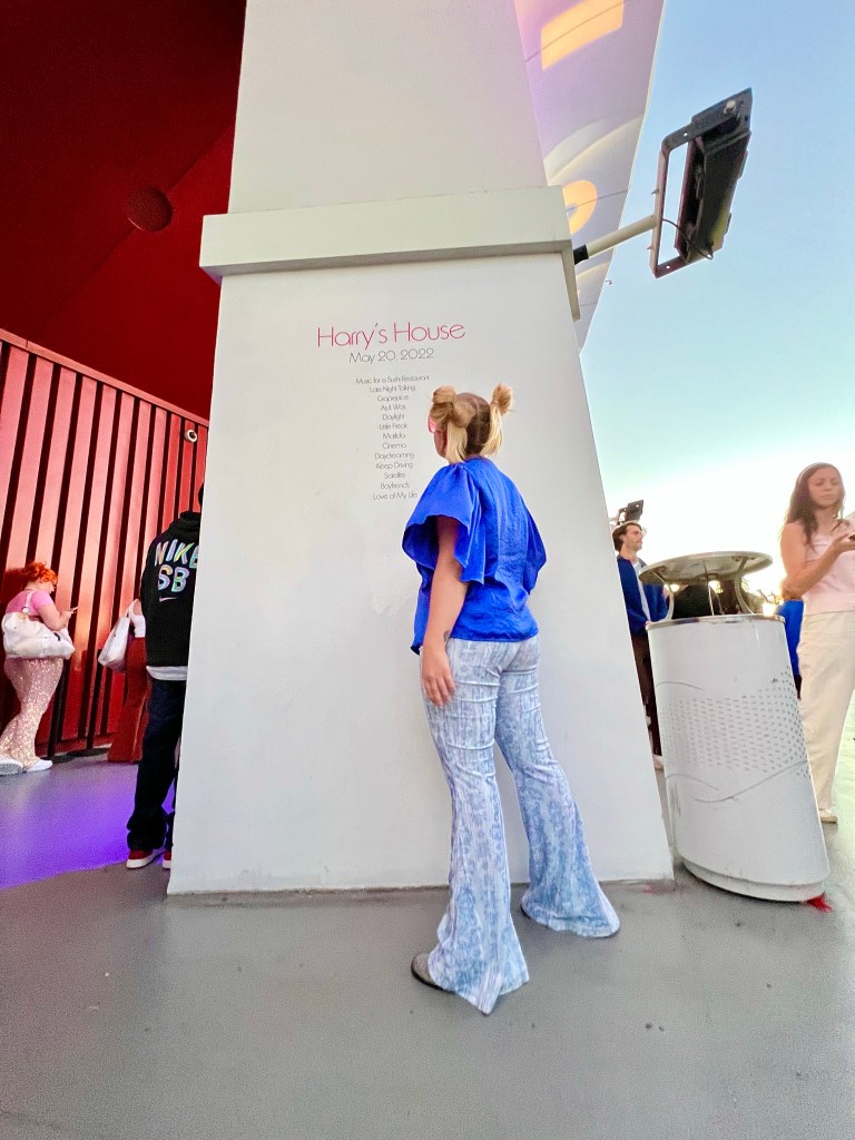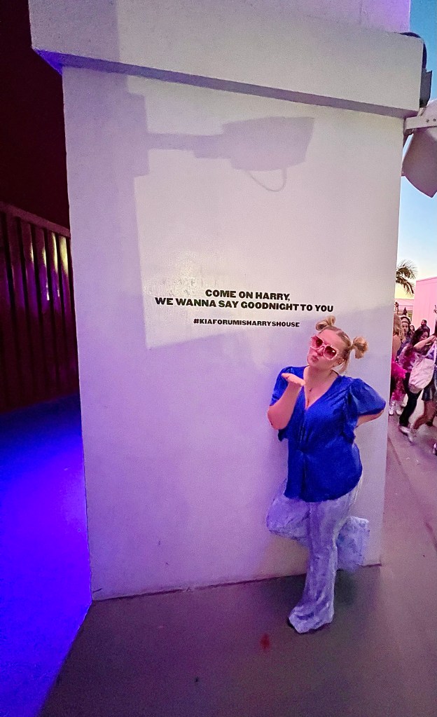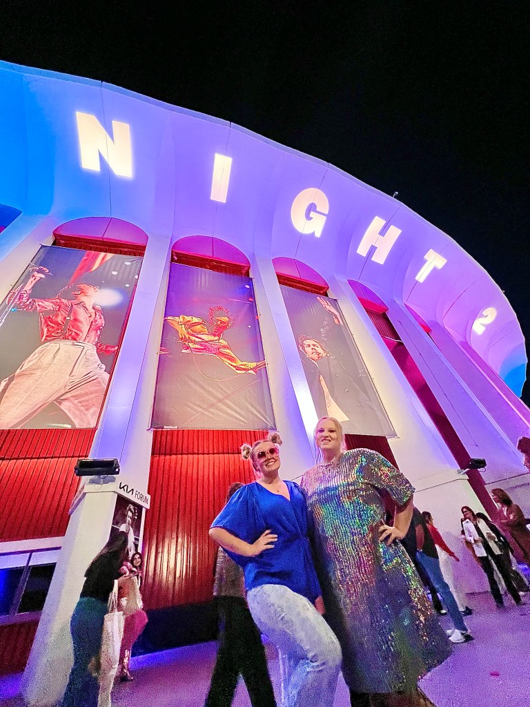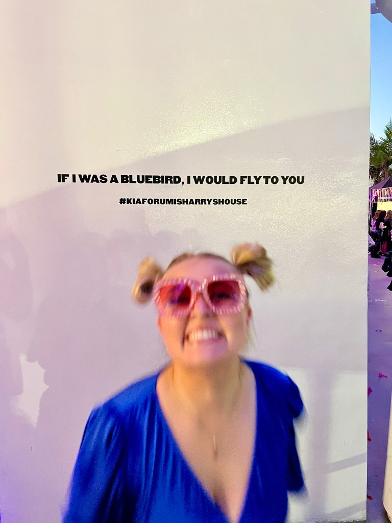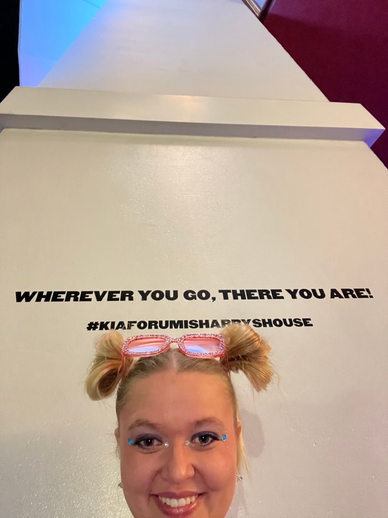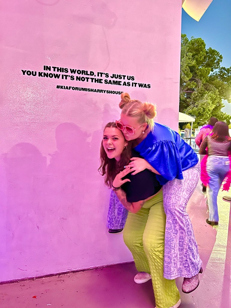The venue itself was absolutely stunning, as expected! We arrived right during golden hour and the sunshine hitting the Forum made for a glowy backdrop. It felt so warm and like I was coming home after a long trip away. Very fitting for Harry’s House theme. The Forum was lit up in rainbow colored lights and buzzing with life. I love that the Forum puts song lyrics and various photo opps around the pillars of the building, so of course we stopped at every single one to take pics!