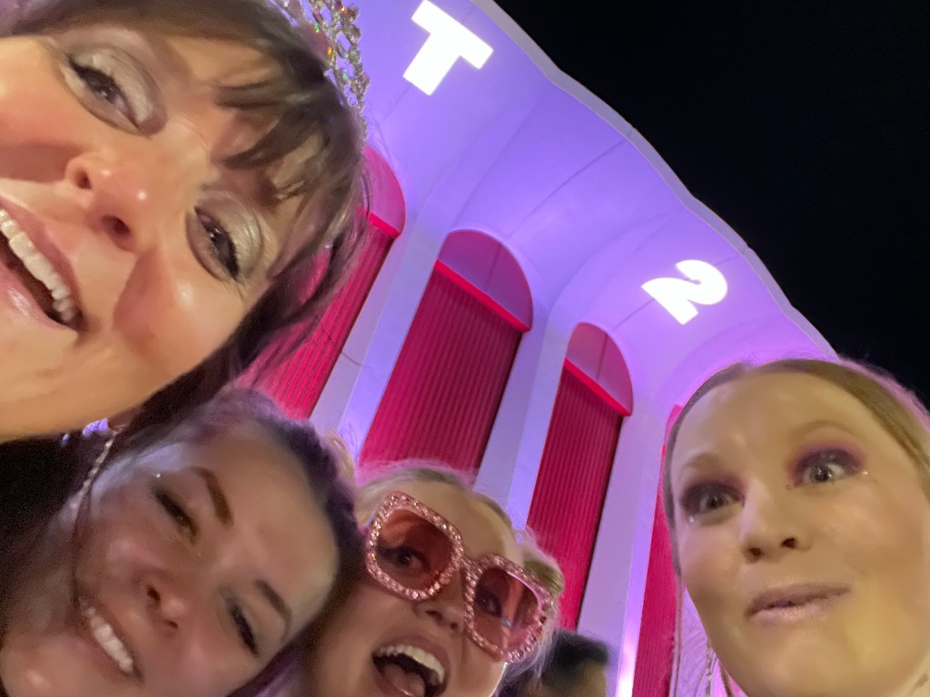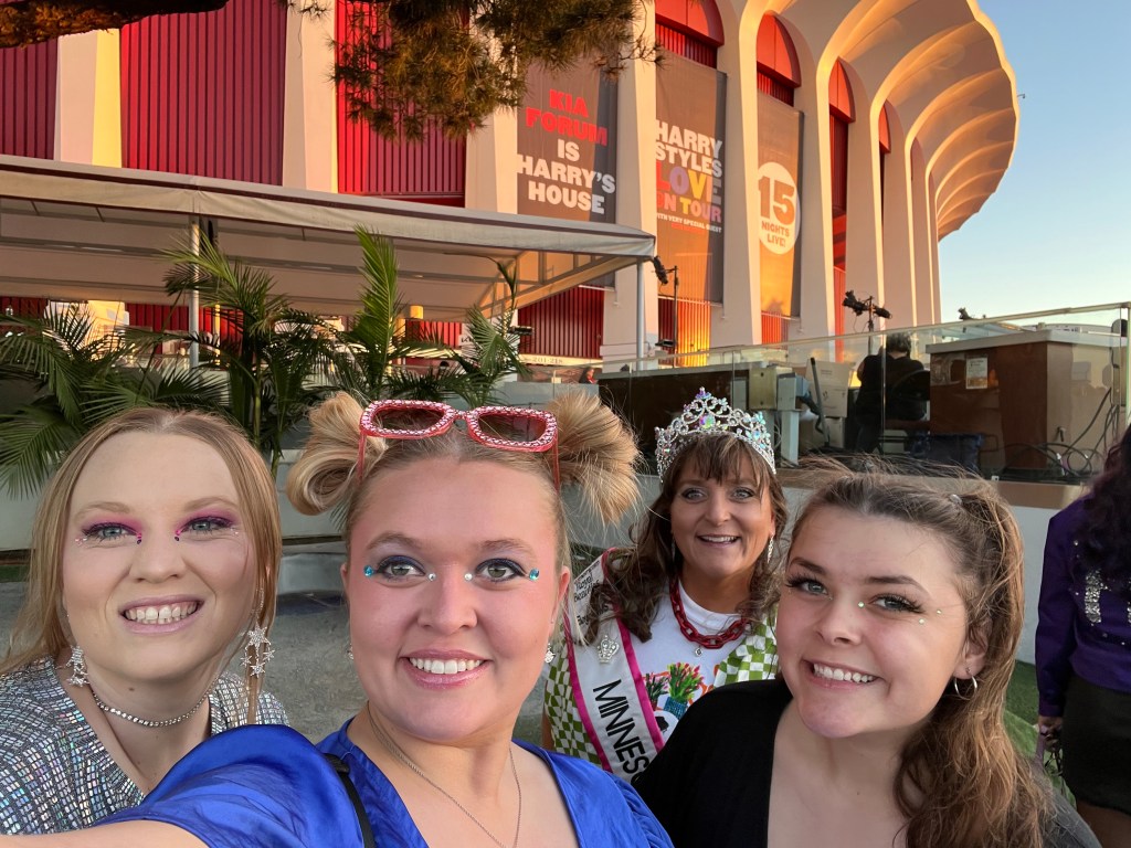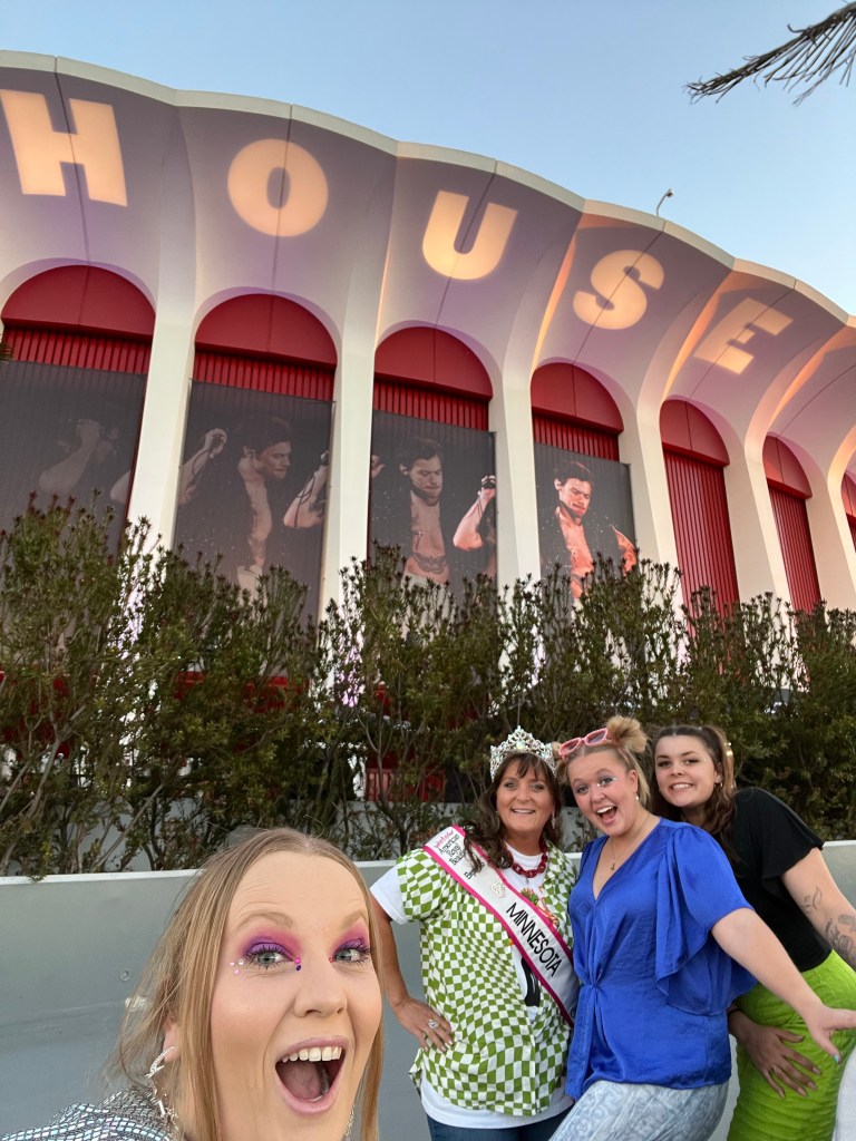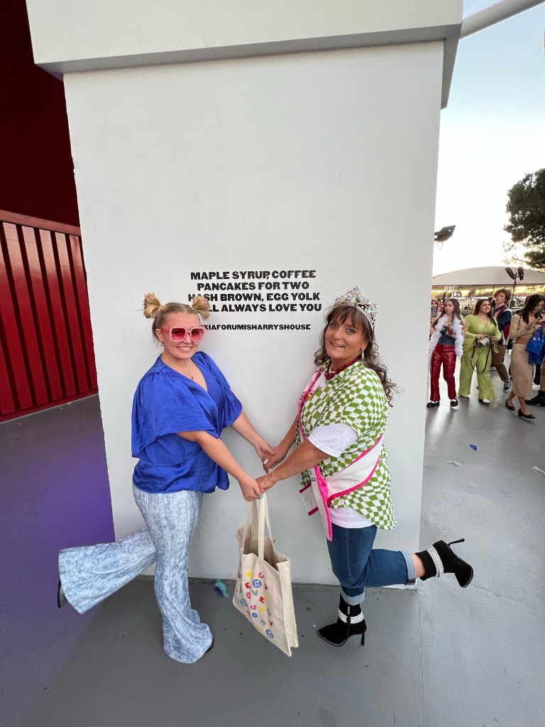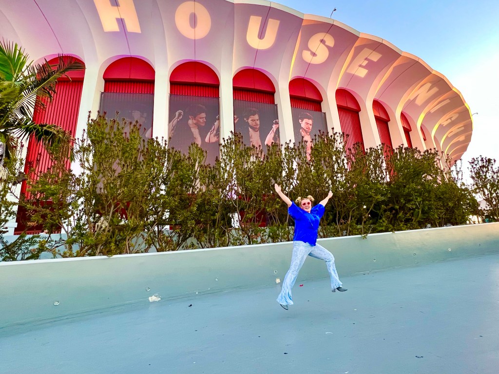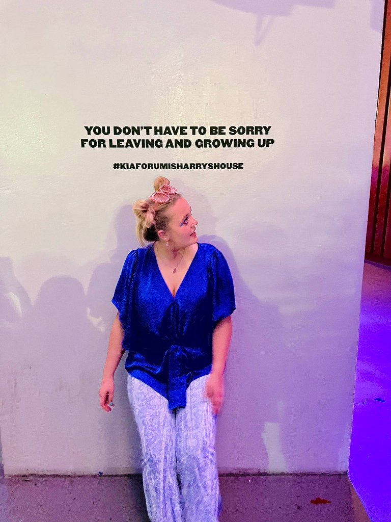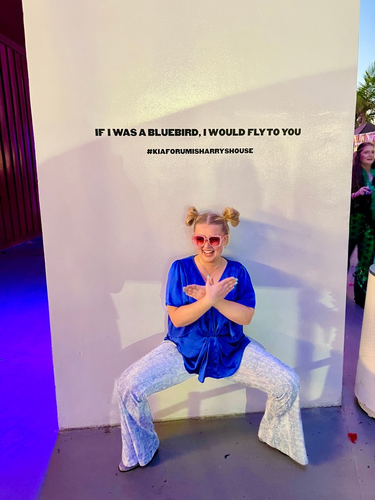 The venue itself was absolutely stunning, as expected! We arrived right during golden hour and the sunshine hitting the Forum made for a glowy backdrop. It felt so warm and like I was coming home after a long trip away. Very fitting for Harry’s House theme. The Forum was lit up in rainbow colored lights and buzzing with life. I love that the Forum puts song lyrics and various photo opps around the pillars of the building, so of course we stopped at every single one to take pics!