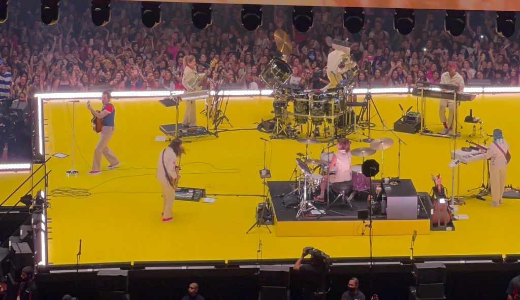 This also wouldn’t be a Harry show without mentioning his outfit of the night. His style is genuine and uniquely his. He wore a pair of light coffee-colored leather pants with a blue and red baseball t-shirt with a sparkly ice cream cone decal on the front. And some classic red vans. Simple, but flashy all the same.